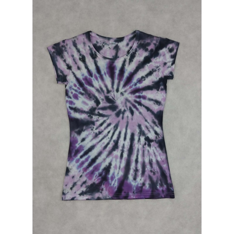 Dámske batikované tričko vo veľkosti S, so špirálkou vo fialových odtieňoch. V páse jemne tvarované. Materiál 100% bavlna.